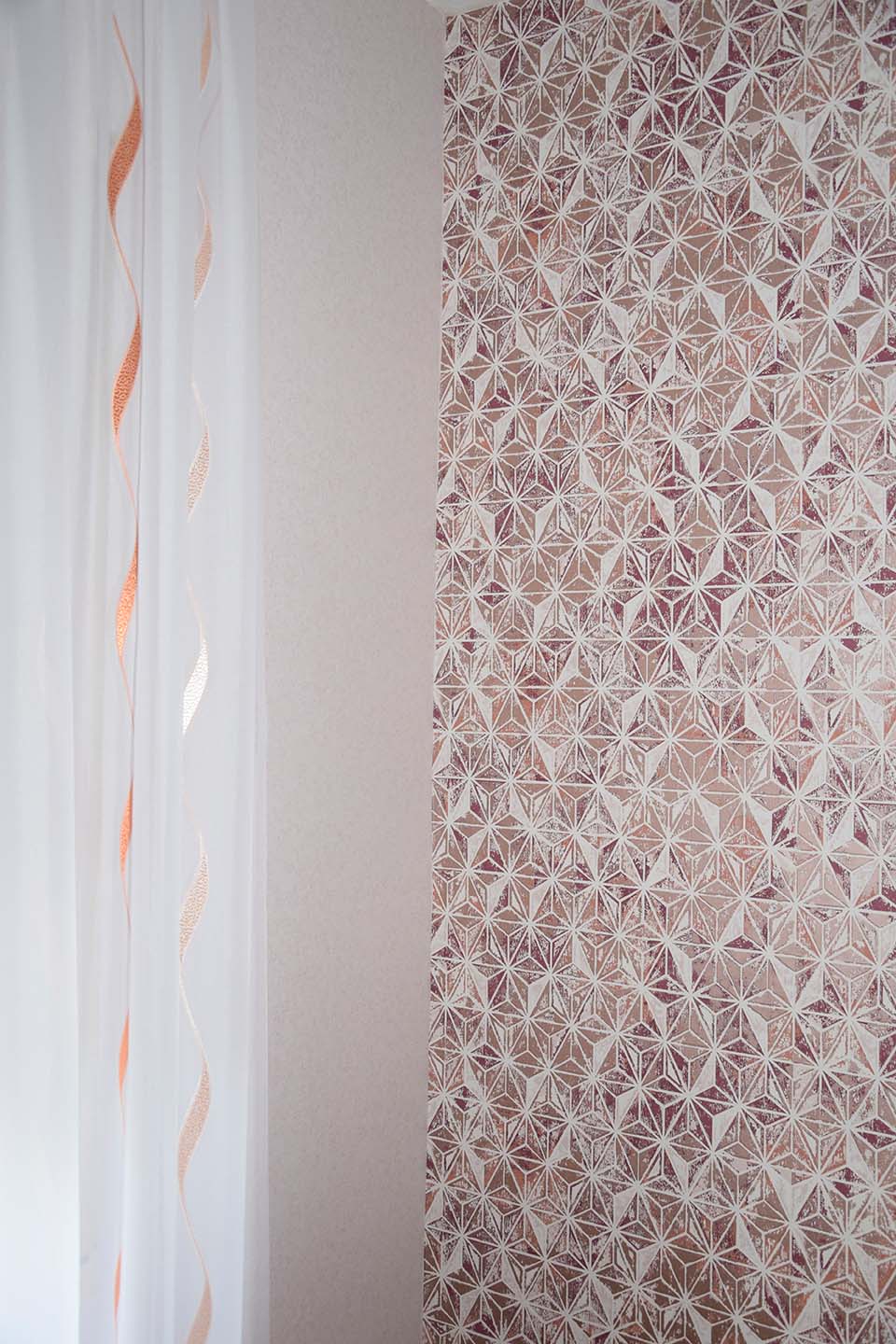 Decke mit Raufaser, Wände mit Mustertapete tapeziert