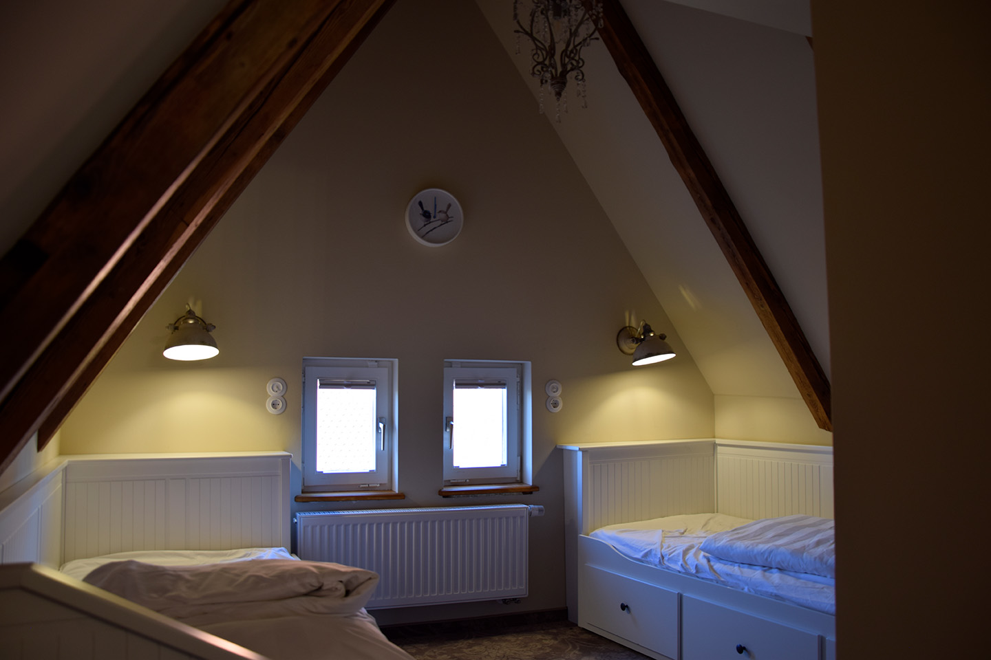 Reichsküchenmeister Ferienwohnungen: Decke, Schrägen und Wände gespachtelt, geschliffen, mit Streichputz grundiert und gestrichen, Fenster weiß lackiert, Holzbalken mit Wachslasur gestrichen