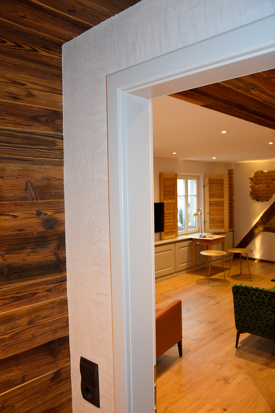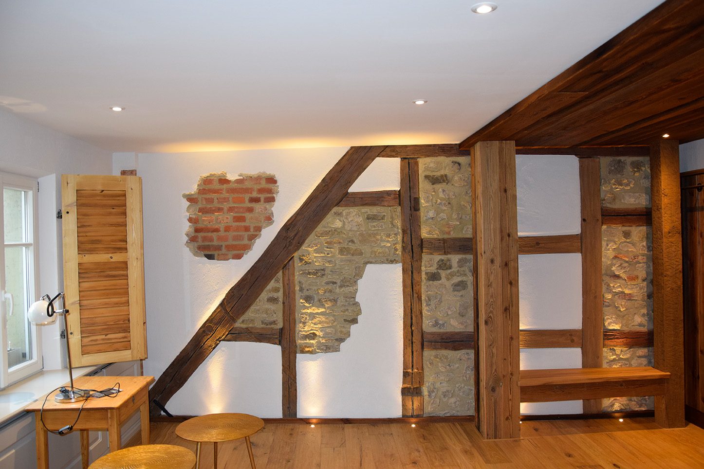 Hotel Markusturm: Decke mit Glasvlies beklebt und gestrichen, Wände mit Kalkputz verputzt und gestrichen, alte Fachwerksteine gereinigt und farblos versiegelt, Holz mit Wachslasur gestrichen